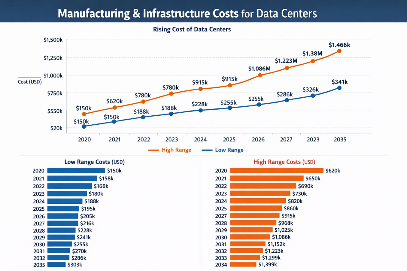 - Lower range costs (~150,000–341,000) are typically for smaller, modular facilities or edge deployments, while the higher range (~620,000–1.466M) is for large hyperscale data centers with high-performance capabilities.